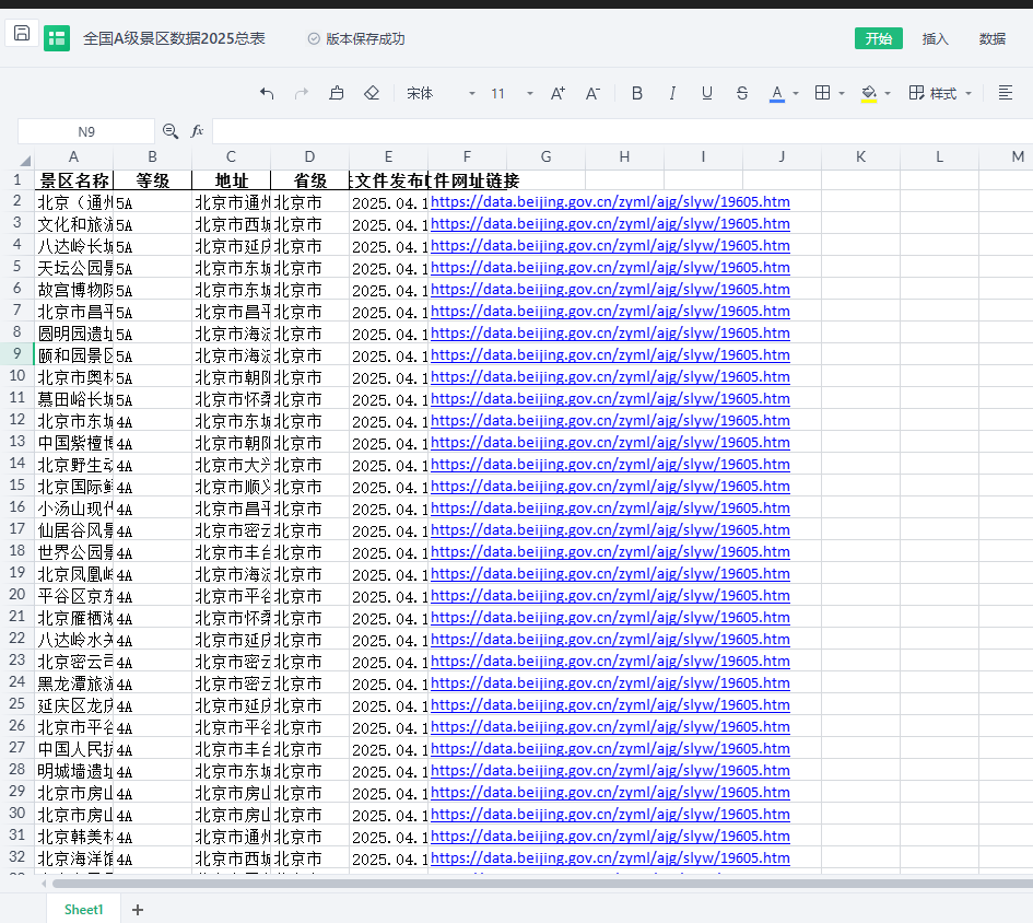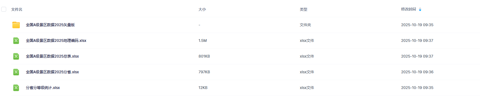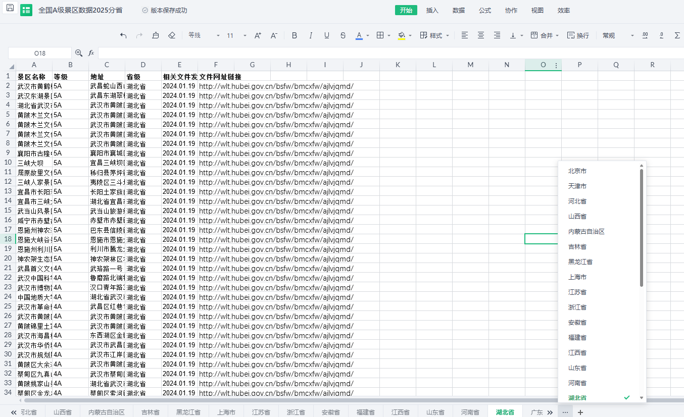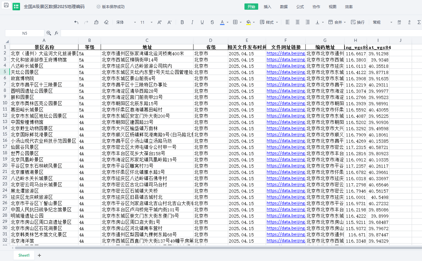 根据各省公开数据整理全国A及至5A及各个景区的基本信息景区名称、等级、所属省份城市区县、坐标、地址以及评定时间等。截止2025年5月份全国31个省份最新A级景区数据。