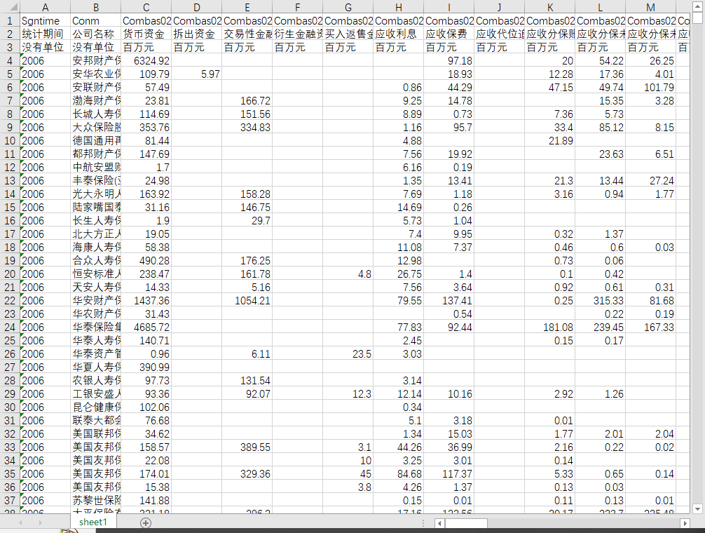 统计期间 公司名称 货币资金 拆出资金 交易性金融资产 衍生金融资产 买入返售金融资产 应收利息 应收保费 应收代位追偿款 应收分保账款 应收分保未到期责任准备金 应收分保未决赔款准备金 应收分保寿险责任准备金 应收分保长期健康险责任准备金 保户质押贷款 存出保证金 其他应收款 定期存款 可供出售金融资产 持有至到期投资 归入贷款及应收款的投资 长期股权投资 商誉 存出资本保证金 投资性房地产 固定资产 在建工程 无形资产 独立帐户资产 递延所得税资产 其他资产 资产总计: 短期借款 拆入资金 交易性金融负债 衍生金融负债 卖出回购金融资产款 预收保费 应付手续费及佣金 应付分保帐款 应付职工薪酬 应交税费 其它应付款 应付利息 应付赔付款 应付保单红利 保户储金及投资款 未到期责任准备金 未决赔款准备金 寿险责任准备金 长期健康险责任准备金 长期借款 应付次级债 预计负债 应付债券 独立账户负债 递延所得税负债 其他负债 负债合计 实收资本(或股本) 资本公积 减:库存股 盈余公积 一般风险准备 未分配利润 外币报表折算差额 归属于母公司所有者权益合计 少数股东权益 所有者权益(或股东权益)合计 负债和所有者权益(或股东权益)总计: