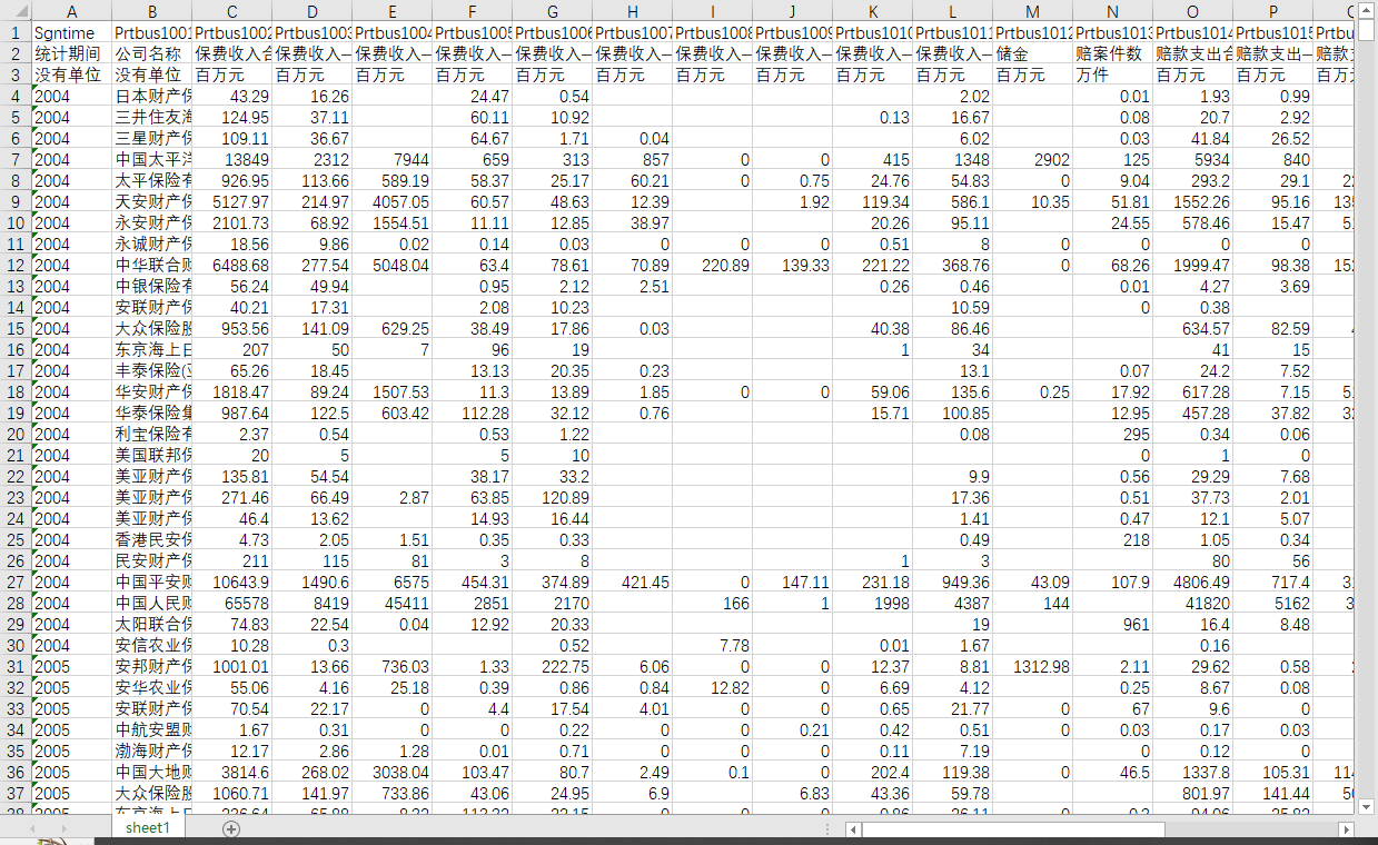 统计期间 公司名称 保费收入合计 保费收入—企业财产保险 保费收入—机动车辆保险 保费收入—货物运输保险 保费收入—责任保险 保费收入—信用保证保险 保费收入—农业保险 保费收入—短期健康保险 保费收入—意外伤害保险 保费收入—其它保险 储金 赔案件数 赔款支出合计 赔款支出—企业财产保险 赔款支出—机动车辆保险 赔款支出—货物运输保险 赔款支出—责任保险 赔款支出—信用保证保险 赔款支出—农业保险 赔款支出—短期健康保险 赔款支出—意外伤害保险 赔款支出—其它保险 未决赔款