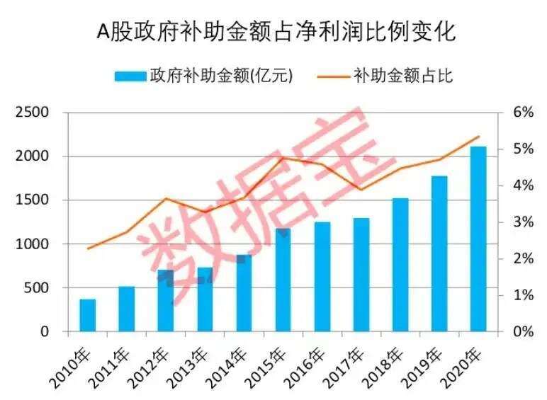 统计显示,2020年政府补助金额占所有上市公司净利润的比例达到5.34%,创下历年新高。