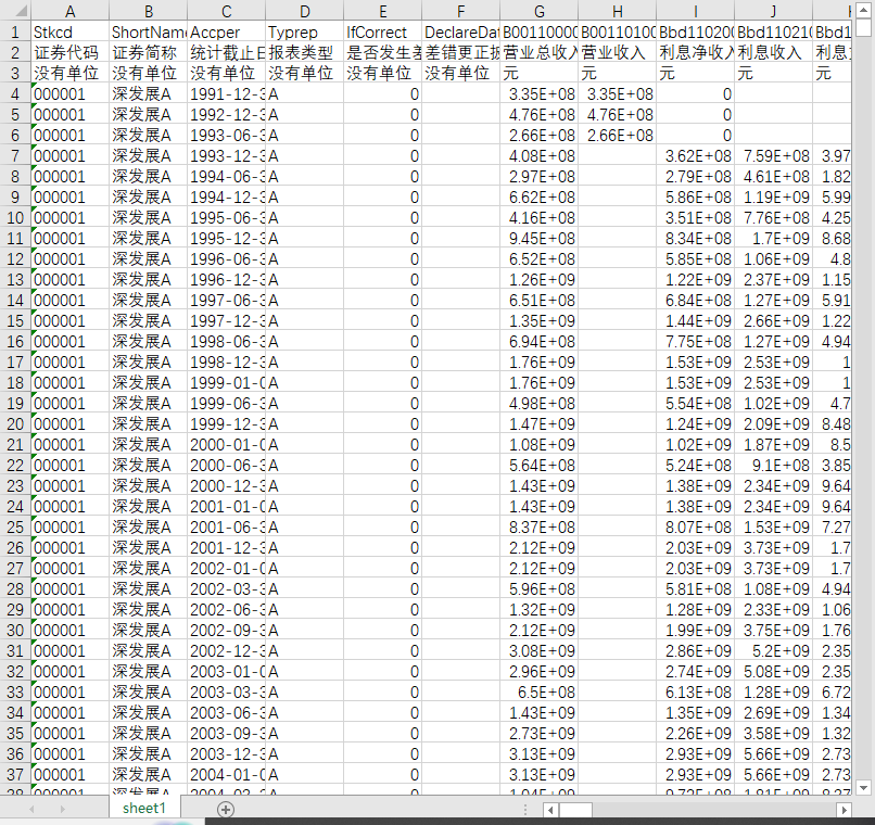 证券代码 证券简称 统计截止日期 报表类型 是否发生差错更正 差错更正披露日期 营业总收入 营业收入 利息净收入 利息收入 利息支出 已赚保费 保险业务收入 其中:分保费收入 减:分出保费 减:提取未到期责任准备金 手续费及佣金净收入 其中:代理买卖证券业务净收入 其中:证券承销业务净收入 其中:受托客户资产管理业务净收入 手续费及佣金收入 手续费及佣金支出 其他业务收入 营业总成本 营业成本 退保金 赔付支出净额 赔付支出 减:摊回赔付支出 提取保险责任准备金净额 提取保险责任准备金 减:摊回保险责任准备金 保单红利支出 分保费用 税金及附加 业务及管理费 减:摊回分保费用 保险业务手续费及佣金支出 销售费用 管理费用 研发费用 财务费用 其中:利息费用(财务费用) 其中:利息收入(财务费用) 其他收益 投资收益 其中:对联营企业和合营企业的投资收益 其中:以摊余成本计量的金融资产终止确认收益 汇兑收益 净敞口套期收益 公允价值变动收益 资产减值损失 信用减值损失 资产处置收益 其他业务成本 其他业务利润 营业利润 加:营业外收入 其中:非流动资产处置利得 减:营业外支出 其中:非流动资产处置净损益 其中:非流动资产处置损失 利润总额 减:所得税费用 未确认的投资损失 影响净利润的其他项目 净利润 持续经营净利润 终止经营净利润 归属于母公司所有者的净利润 归属于母公司其他权益工具持有者的净利润 少数股东损益 基本每股收益 稀释每股收益 其他综合收益(损失) 归属母公司所有者的其他综合收益的税后净额 归属于少数股东的其他综合收益的税后净额 综合收益总额 归属于母公司所有者的综合收益 归属于母公司其他权益工具持有者的综合收益总额 归属少数股东的综合收益