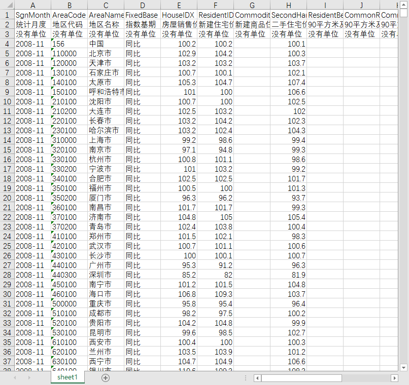 统计月度 地区代码 地区名称 指数基期 房屋销售价格指数 新建住宅价格指数 新建商品住宅价格指数 二手住宅价格指数 90平方米及以下新建住宅价格指数 90平方米及以下新建普通住宅价格指数 90平方米及以下新建商品住宅价格指数 90-144平方米新建商品住宅价格指数 144平方米以上新建商品住宅价格指数 90平方米及以下二手住宅格指数 90-144平方米二手住宅价格指数 144平方米以上二手住宅价格指数