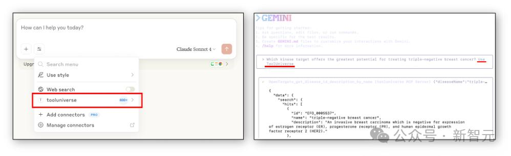 图4: ToolUniverse 为构建不同类型的AI科学家提供了简洁而高效的协议:既可用于基于通用大语言模型(如左图的 Claude),也可用于具备更强推理与控制能力的智能体系统(如右图的 Gemini-CLI),以及专注于生物医学研究的AI智能体(如 TxAgent)。
