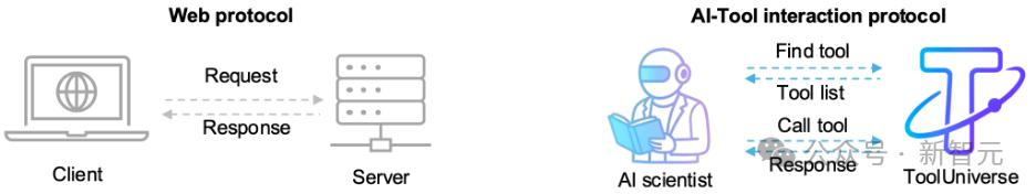 图2: ToolUniverse通过统一协议连接机器学习模型、智能体、科学软件工具、数据库与API。它引入了标准化的工具规范框架,使语言模型能够一致地发现、调用并解析各类工具。类似于HTTP在互联网通信中确立标准的方式,ToolUniverse 协议通过两项核心操作:Find Tool(查找工具) 与Call Tool(调用工具), 定义了AI科学家如何请求工具并接收结果。