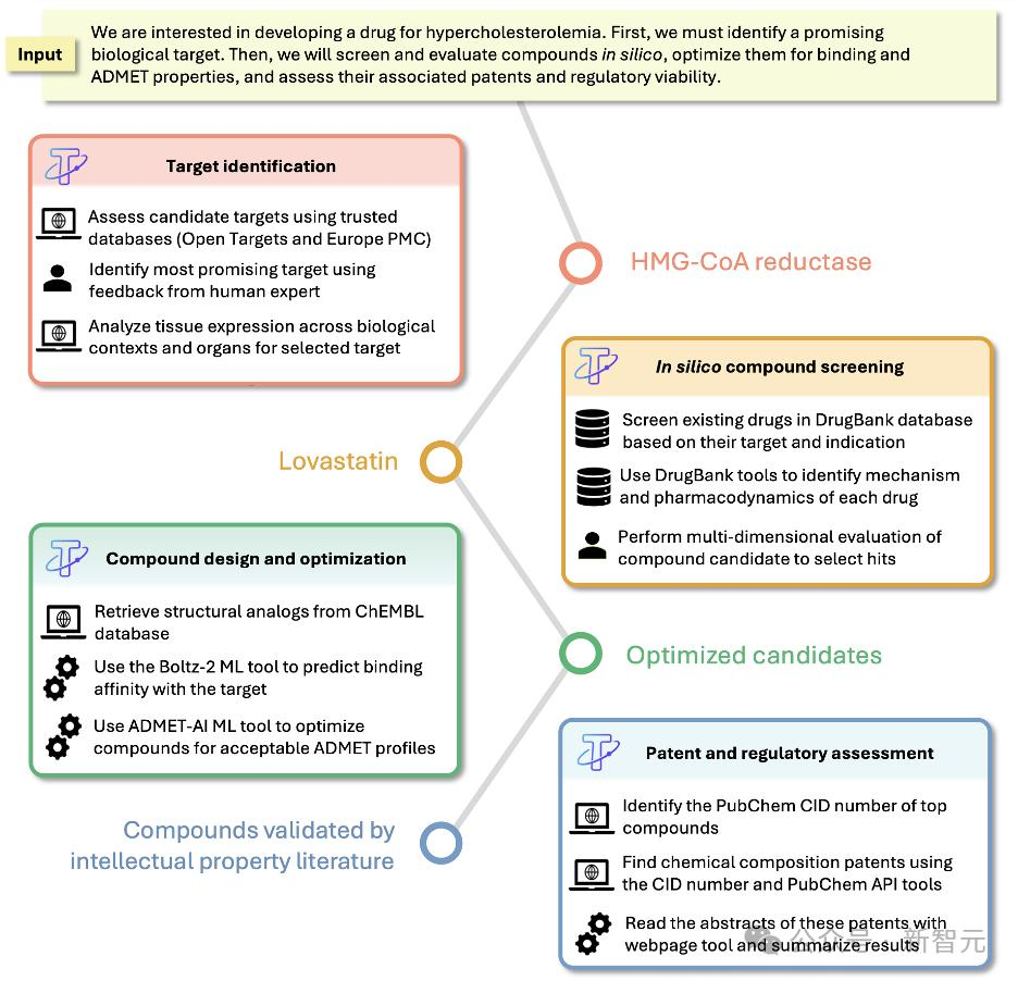 AI首先调用 「文献挖掘工具」 和 「药物 – 靶点数据库」,通过分析 thousands of 研究论文与临床数据,得出结论:HMG-CoA 还原酶是胆固醇合成的关键酶,且该酶在肝脏外的过度抑制会引发肌肉疼痛等副作用。这一步完全复刻了人类科学家的 「靶点发现」 逻辑,但效率提升 10 倍以上。