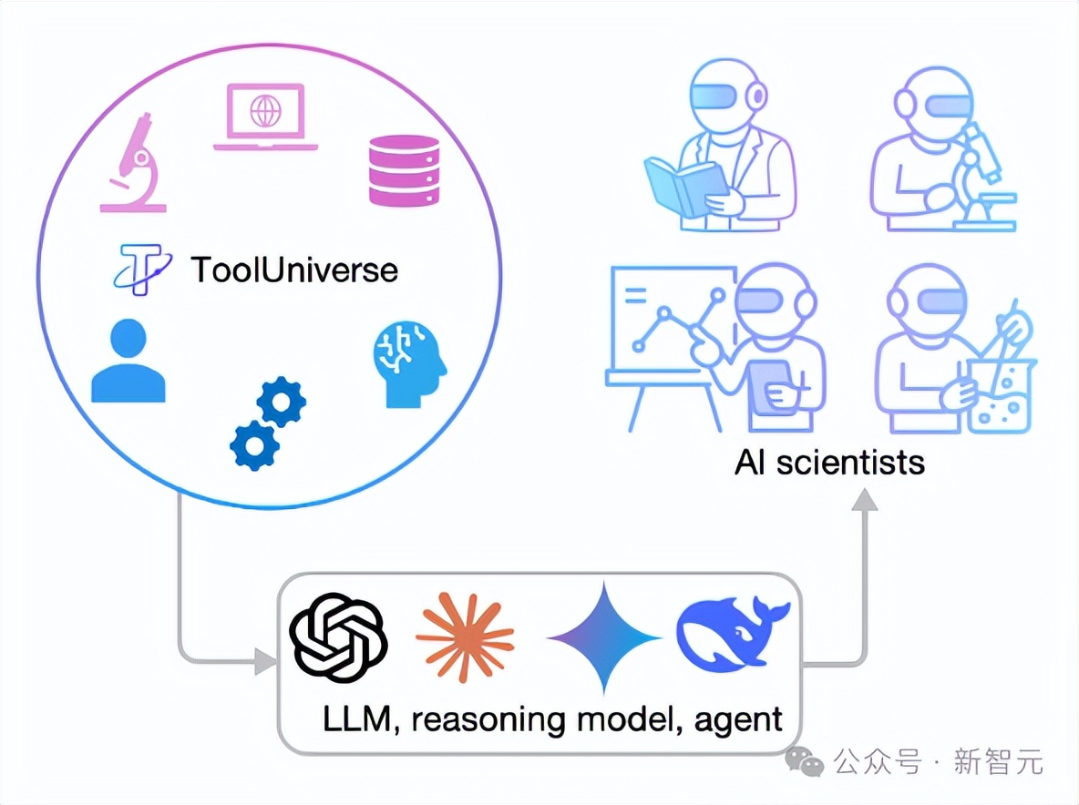 图1:ToolUniverse 是一个用于打造AI科学家的生态系统。通用型大语言模型(LLM)、推理模型与智能体可连接ToolUniverse提供的600余种科学工具,实现科研工作流自动化。
