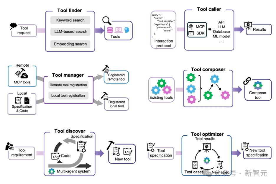 图3: ToolUniverse 提供了六项关键能力,支持AI科学家完整的生命周期:查找工具、调用工具、添加新工具、将工具串联为工作流、从自然语言生成新工具,以及优化工具规范以提升可用性。