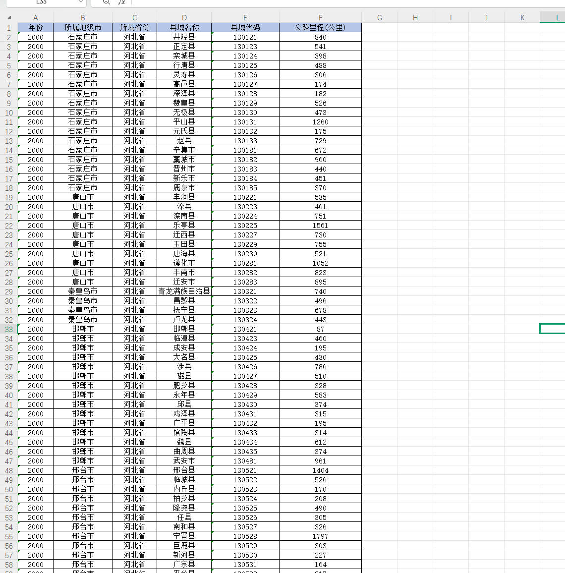 年份 所属地级市 所属省份 县域名称 县域代码 公路里程(公里)