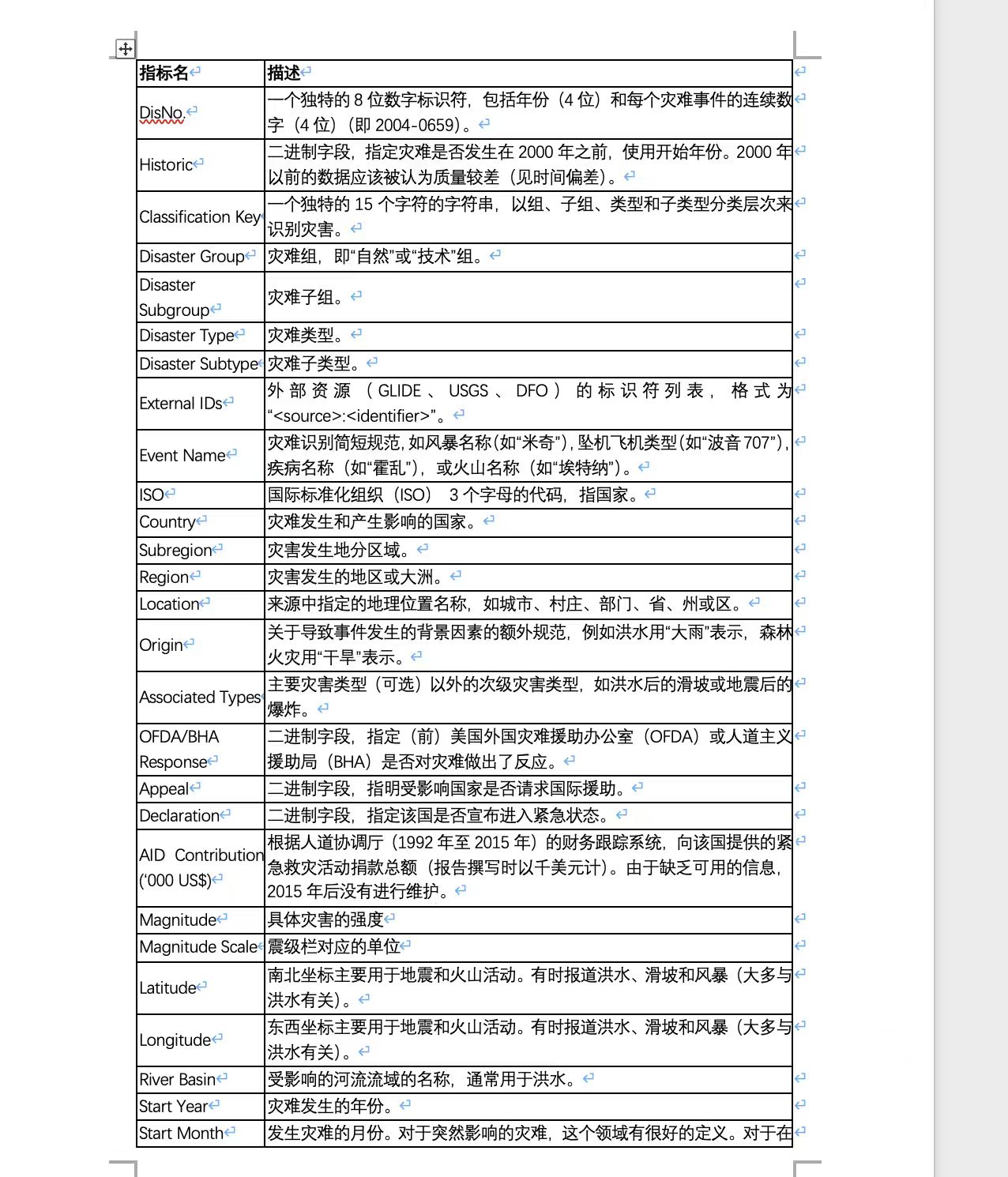 具体指标为 灾害代码 历史记录 分类键 灾害组 灾害子组 灾害类型 灾害子类型 外部资源标识 事件名称 ISO代码 国家/地区 子区域 区域 位置 灾害源头 Associated Types 吁请援助 吁请援助 紧急状态宣布 AID 紧急状态 ('000 US$) 灾害量级 灾害量级单位 纬度 经度 江河流域 开始年份 开始月份 开始日 结束年份 结束月份 结束日 总死亡数 受伤人数 受灾人数 流离失所人数 总受灾人数 重建成本 ('000 US$) 重建成本, 调整 ('000 US$) 承保损失('000 US$) 承保损失, 调整 ('000 US$) 总经济损失 ('000 US$) 总经济损失, 调整 ('000 US$) CPI 行政单位 记录输入日期 最近更新