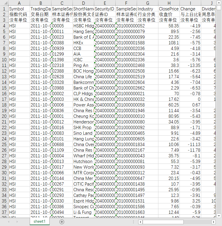指数代码 交易日期 样本证券代码 股份英文名称 证券ID 样本证券ID 行业分类 收盘价 与上日比较跌升(%) 周息率(%) 市盈率(倍) 指数因子 影响指数升跌 分类市值比重(%) 占指数市值比重(%)