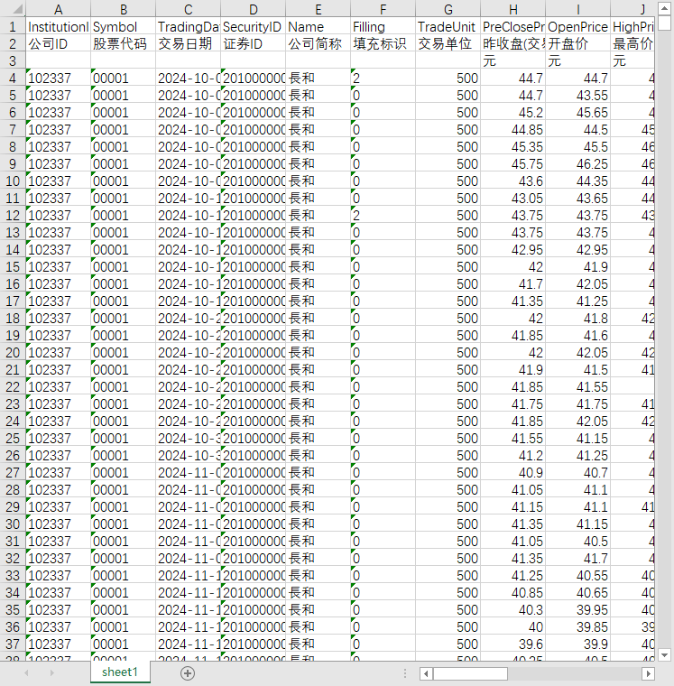 公司ID 股票代码 交易日期 证券ID 公司简称 填充标识 交易单位 昨收盘(交易所) 开盘价 最高价 最低价 收盘价 成交量 成交金额 涨跌额 涨跌幅 振幅 换手率 总市值 流通市值 股息率 市盈率 市净率 市销率 市现率