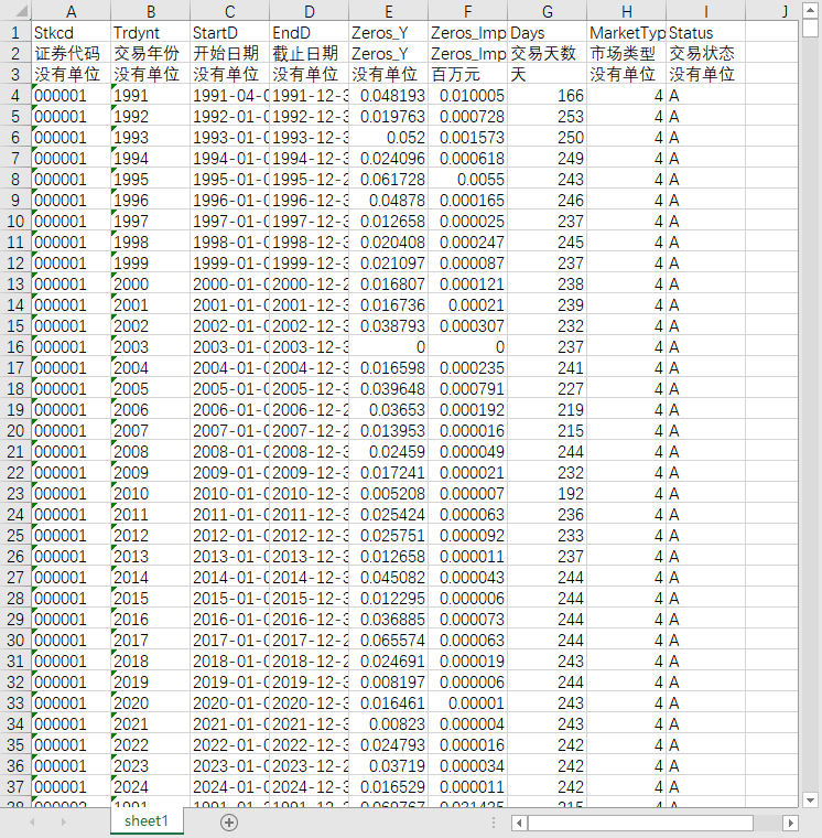 证券代码 交易年份 开始日期 截止日期 Zeros_Y Zeros_Impact_Y 交易天数 市场类型 交易状态