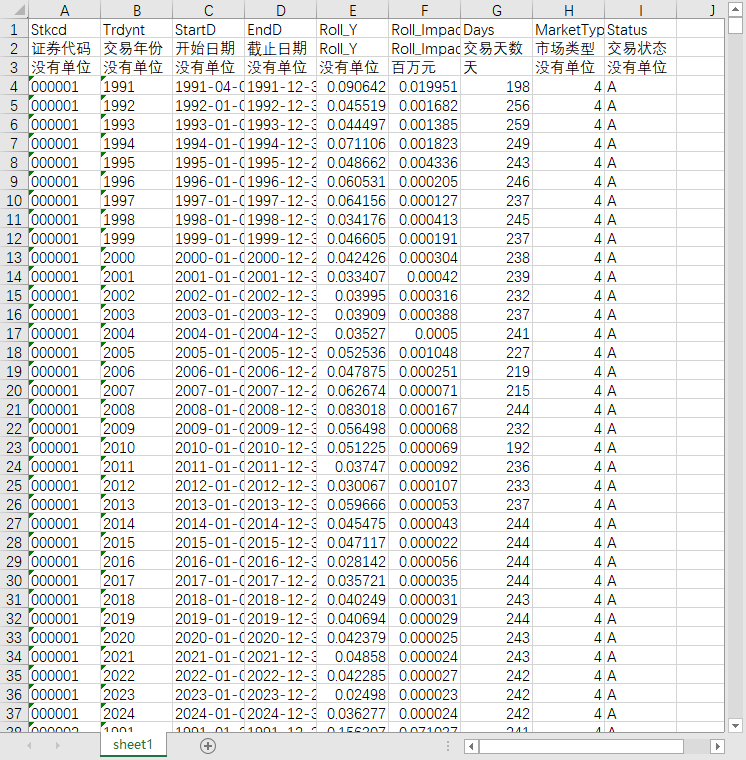 Roll_Y [Roll_Y] - 采用日收益率估计的Roll指标,字段说明见说明书“3.2 Roll指标”。