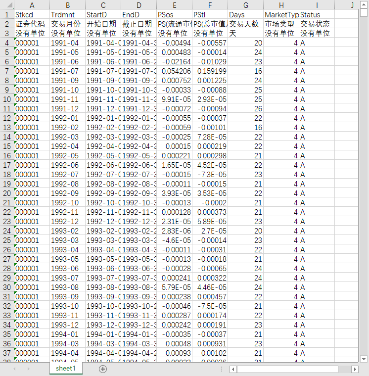 证券代码 交易月份 开始日期 截止日期 PS(流通市值加权) PS(总市值加权) 交易天数 市场类型 交易状态