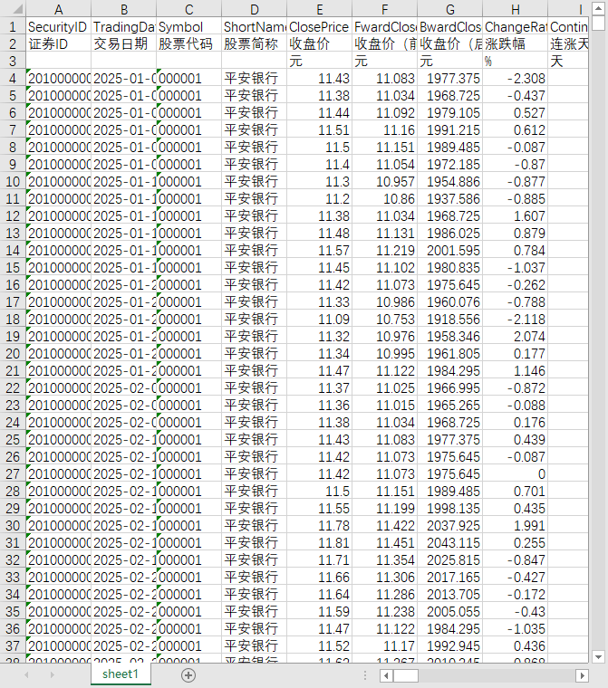 证券ID 交易日期 股票代码 股票简称 收盘价 收盘价(前复权) 收盘价(后复权) 涨跌幅 连涨天数 连跌天数 连续放量天数 连续缩量天数 是否破发 是否破净 历史最高价 历史最高价(前复权) 历史最高价(后复权) 是否创历史新高 是否创历史新高(前复权) 是否创历史新高(后复权) 历史最低价 历史最低价(前复权) 历史最低价(后复权) 是否创历史新低 是否创历史新低(前复权) 是否创历史新低(后复权) 一周最高价 一周最高价(前复权) 一周最高价(后复权) 一月最高价 一月最高价(前复权) 一月最高价(后复权) 三月最高价 三月最高价(前复权) 三月最高价(后复权) 六月最高价 六月最高价(前复权) 六月最高价(后复权) 一年最高价 一年最高价(前复权) 一年最高价(后复权) 一周最低价 一周最低价(前复权) 一周最低价(后复权) 一月最低价 一月最低价(前复权) 一月最低价(后复权) 三月最低价 三月最低价(前复权) 三月最低价(后复权) 六月最低价 六月最低价(前复权) 六月最低价(后复权) 一年最低价 一年最低价(前复权) 一年最低价(后复权)