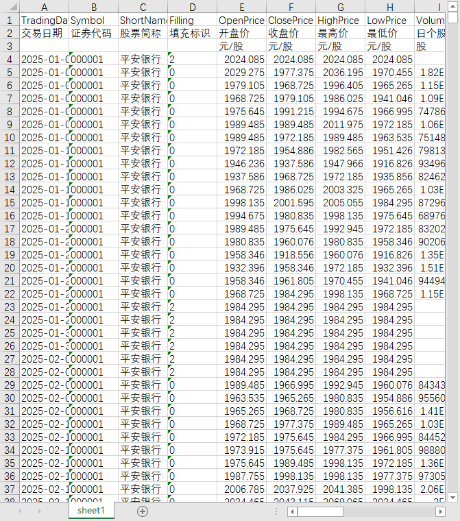 交易日期 证券代码 股票简称 填充标识 开盘价 收盘价 最高价 最低价 日个股交易股数 日个股交易金额 距前交易日天数 交易状态编码 均价 涨跌幅 总股本 流通股本 换手率 日个股总市值 日个股流通市值 流通A股股本 流通B股股本 流通A股市值 流通B股市值 最新股本变动日期