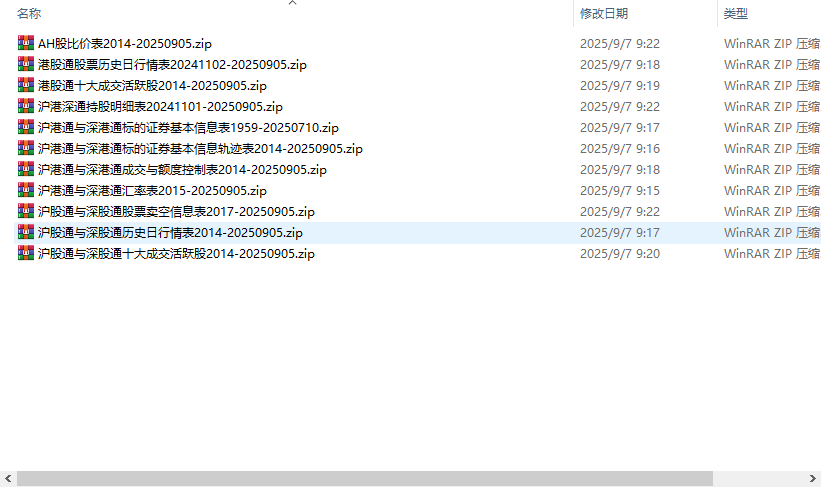 沪港通与深港通数据集2014-20250905股票卖空信息表历史日行情表十大成交活跃股AH股比价表等