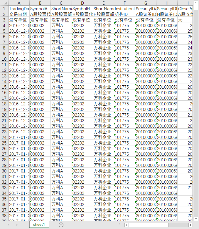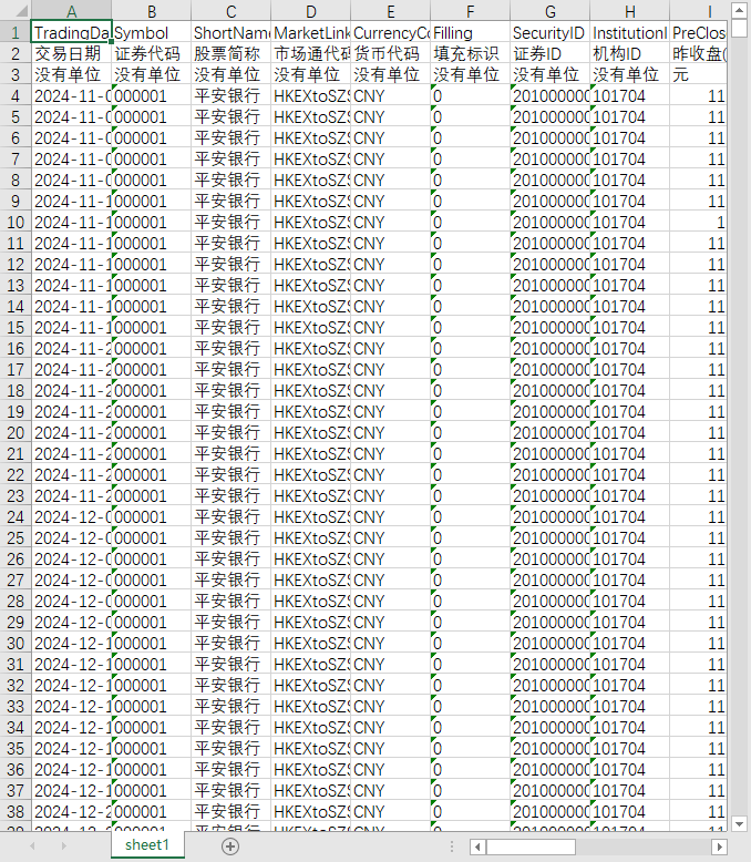 交易日期 证券代码 股票简称 市场通代码 货币代码 填充标识 证券ID 机构ID 昨收盘(交易所) 开盘价 收盘价 最高价 最低价 成交量 成交金额 涨跌 涨跌幅 市场通开闭状态 交易状态ID 交易状态