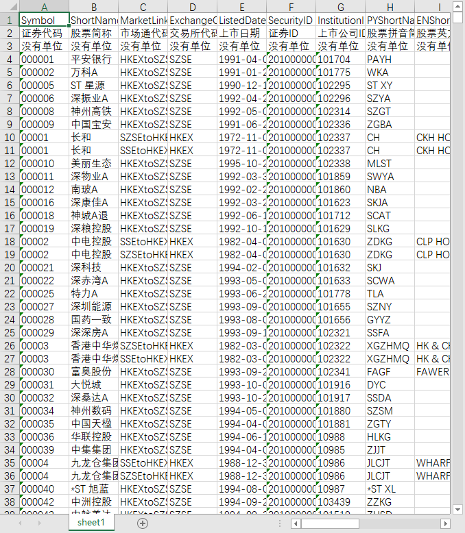 证券代码 股票简称 市场通代码 交易所代码 上市日期 证券ID 上市公司ID 股票拼音简称 股票英文简称 退市日期 被调入日期 发行价格币种 上市状态编码 发行价格 是否AH同时发行 首次被调入日期 被调出日期 交易状态ID 交易状态