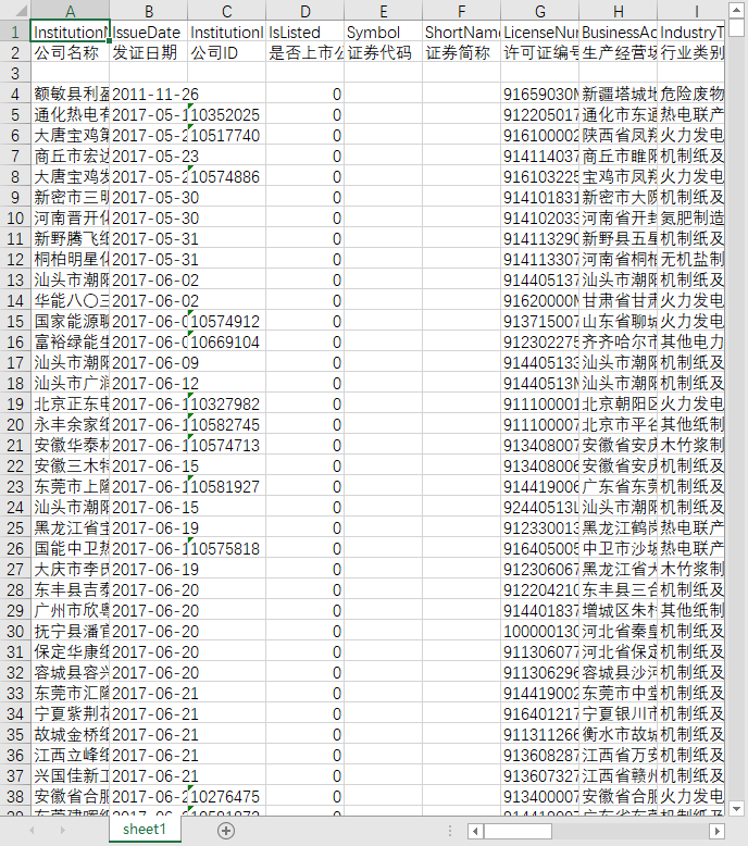 公司名称 发证日期 公司ID 是否上市公司 证券代码 证券简称 许可证编号 生产经营场所地址 行业类别 所属省份代码 所属省份 所属城市代码 所属城市 所属区县 发证机关 版本 有效期开始日期 有效期截止日期 主要污染物类别 大气主要污染物种类 大气污染物排放规律 大气污染物排放执行标准 废水主要污染物种类 废水污染物排放规律 废水污染物排放执行标准 排污权使用和交易信息