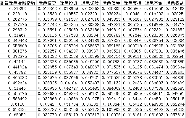 中国各省的绿色金融指数数据,采用熵值法进行测算,熵值法是指用来判断某个指标的离散程度的数学方法,离散程度越大,对该指标对综合评价的影响越大。综合评价体系如下: