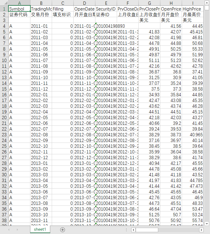 证券代码 交易月份 填充标识 月开盘日期 证券ID 上月收盘日 上月收盘价 月开盘价 月最高价 月最低价 月最高价日 月最低价日 月收盘价 月收盘日期 月最高收盘价 月最低收盘价 月均价 月涨跌 月涨跌幅 月成交量 月成交额 月振幅 月最高收盘价日 月最低收盘价日 月交易天数