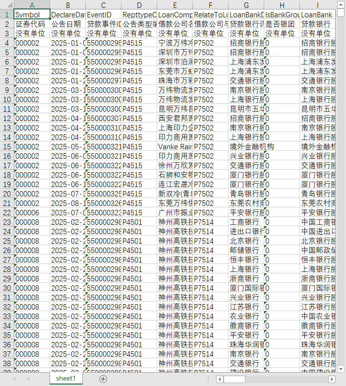证券代码 公告日期 贷款事件ID 公告类型编码 借款公司名称 借款公司与上市公司关系编码 贷款银行详情 是否银团 贷款银行 贷款银行数 银行所在地 是否签约 是否终止 贷款进程 签约日期 币种编码 币种 贷款金额上限 贷款金额下限 最新贷款金额 累计贷款金额 最近还款金额 最新还款日期 累计还款金额 贷款期限 续借期限 续借日期 贷款起始日期 贷款结束日期 逾期日期 逾期利率(%) 逾期金额 基准利率(%) 贷款利率(%) 贷款浮动利率 贷款类型编码 是否有抵押质押物 资金投向 资金投向编码 公告标题 公告内容 披露情况 备注