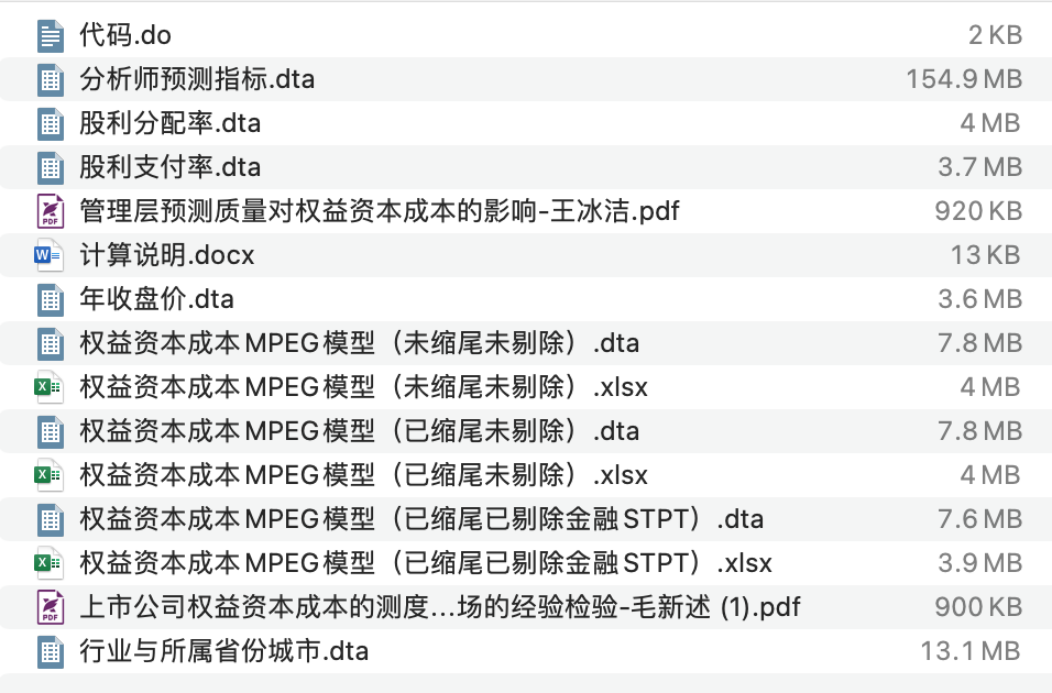 上市公司权益资本成本有多种测算方法,本次参考王冰洁、刘振涛(2017)的文章利用MPEG模型进行衡量,MPEG模型作为一种基于管理层盈利预测的估算方法,能够更准确地反映资本市场对公司未来发展的预期。本次分享数据涵盖2001-2024年,包含原始数据、计算代码、参考文献、缩尾以及未缩尾等多版本结果