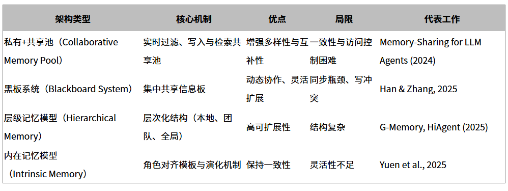 多智能体记忆(MAS):在多智能体环境中,记忆需支持协作与共享。当前主要架构包括: