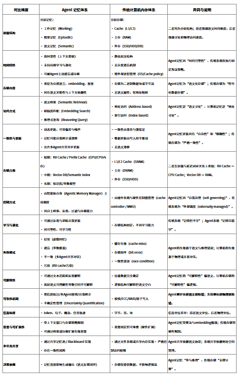 2.4 Agent记忆系统和传统计算内存系统的比较