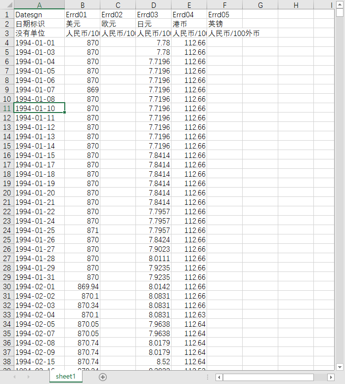 商品期货人民币基准汇价日数据文件1994-202404美元欧元日元港币英镑