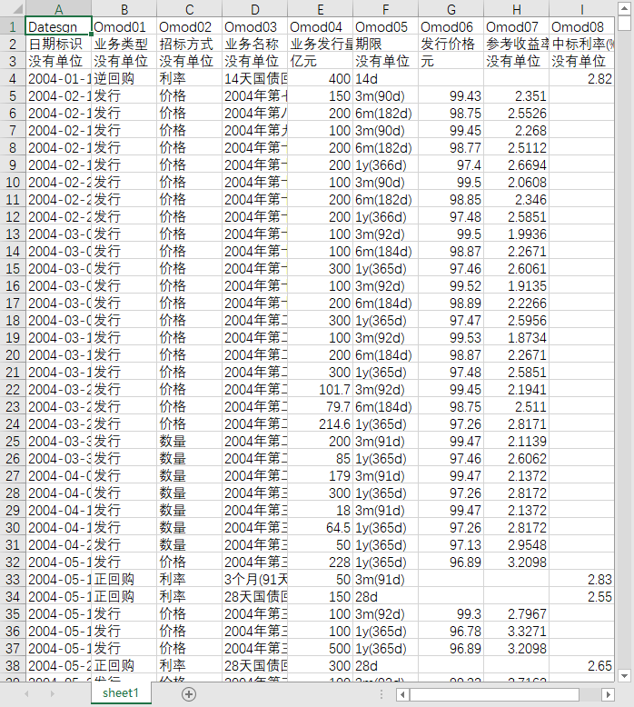 日期标识 业务类型 招标方式 业务名称 业务发行量/交易量 期限 发行价格 参考收益率(%) 中标利率(%)