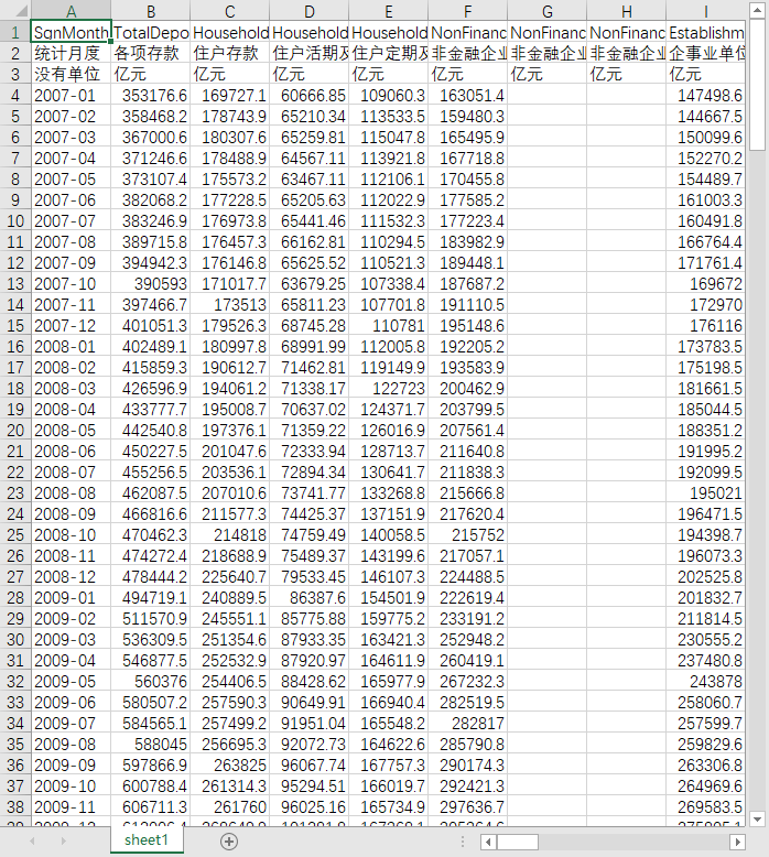 统计月度 各项存款 单位存款 单位活期存款 单位定期存款 单位通知存款 单位保证金存款 个人存款 储蓄存款 活期储蓄存款 定期储蓄存款 个人保证金存款 个人结构性存款 财政性存款 临时性存款 委托存款 其他存款 金融债券 对国际金融机构负债 其他 资金来源总计 各项贷款 境内贷款 短期贷款 中长期贷款 委托贷款 其他贷款 融资租赁 票据融资 各项垫款 境外贷款 有价证券及投资 有价证券 股权及其他投资 黄金占款 财政借款 在国际金融机构资产 资金运用总计 境内存款 住户存款 住户活期存款 住户定期及其他存款 非金融企业存款 非金融企业活期存款 非金融企业定期及其他存款 政府存款 机关团体存款 非银行业金融机构存款 境外存款 住户贷款 住户短期贷款 住户短期消费性贷款 住户短期经营性贷款 住户中长期贷款 住户中长期消费性贷款 住户中长期经营性贷款 非金融企业及机关团体贷款 非金融企业短期贷款 非金融企业中长期贷款 非银行业金融机构贷款