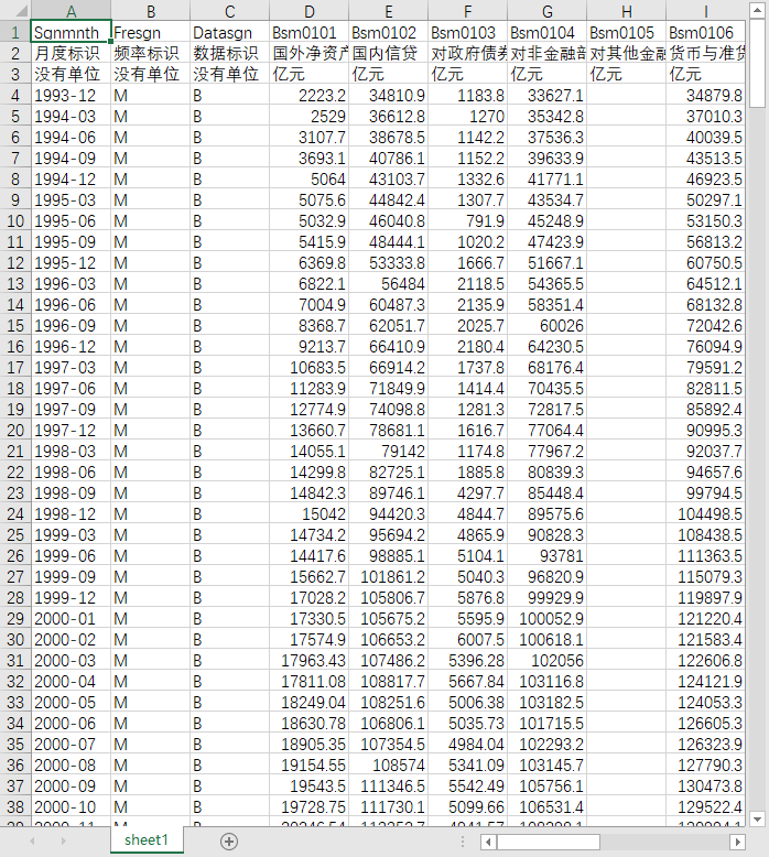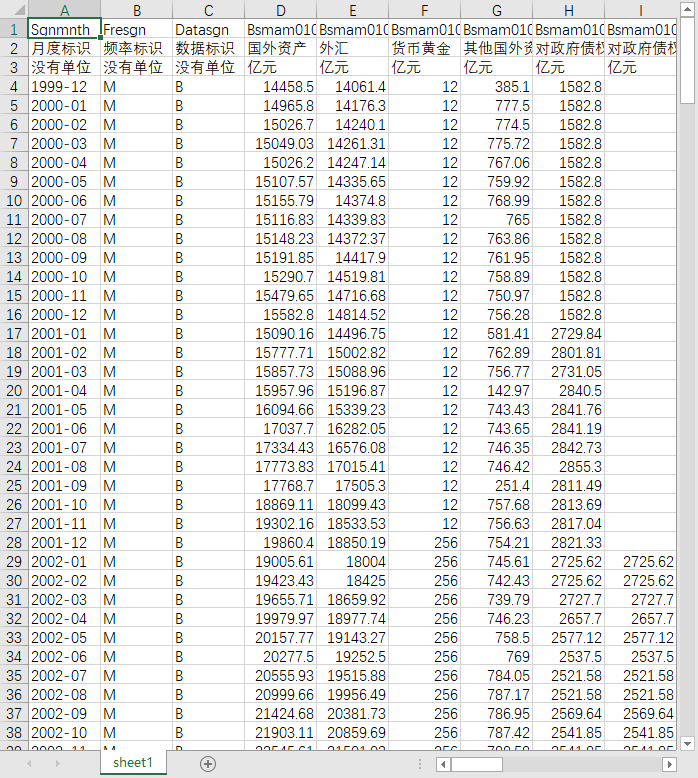 月度标识 频率标识 数据标识 国外资产 外汇 货币黄金 其他国外资产 对政府债权 对政府债权-中央政府 对其他存款性公司债权 对其他金融性公司债权 对非金融性公司债权 其他资产 总资产 储备货币 货币发行 金融性公司存款 其他存款性公司 其他金融性公司 非金融性公司存款 活期存款 发行债券 国外负债 政府存款 自有资金 其他负债 总负债 对存款货币银行债权 对特定存款机构债权 对非货币金融机构债权 存款货币银行存款 特定存款机构存款 储蓄存款 准备金存款 不计入储备货币的金融性公司存款 中央政府存款