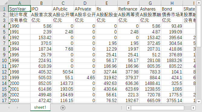 统计年度 A股首次发行金额 A股公开增发金额 A股非公开增发金额 A股配股金额 A股再筹资金额 A股股票融资总额 债券市场筹资总额 股票融资占股票债券融资比例(%)