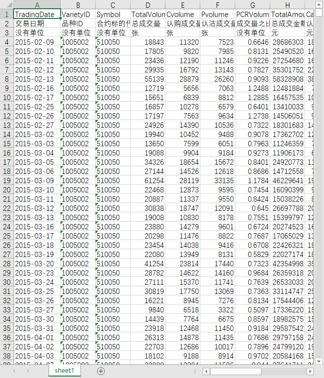 交易日期 品种ID 合约标的代码 总成交量 认购成交量 认沽成交量 成交量之比 总成交金额 认购成交金额 认沽成交金额 成交金额之比 未平仓总数 未平仓认购合约数 未平仓认沽合约数 未平仓之比