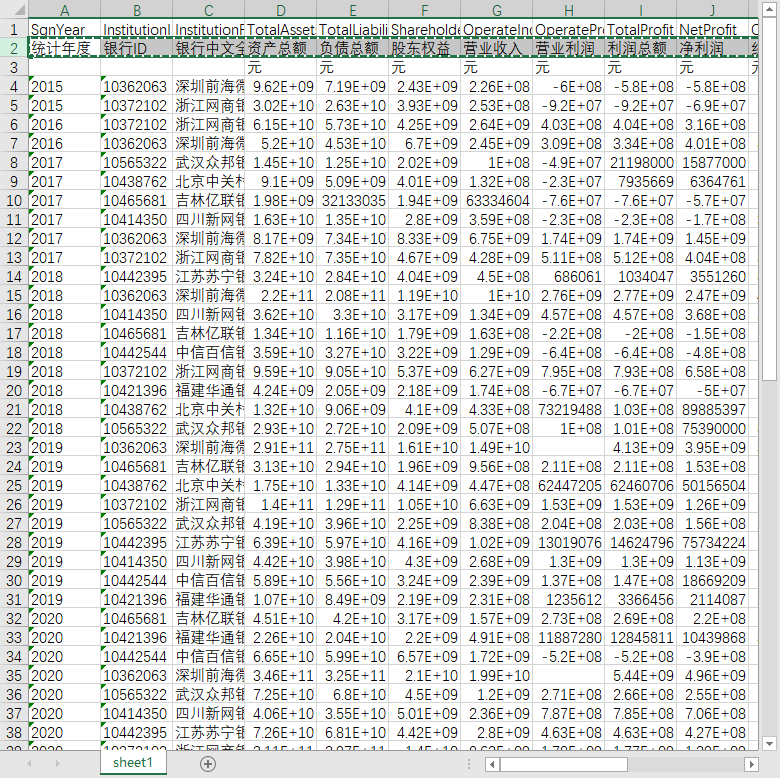 统计年度 银行ID 银行中文全称 资产总额 负债总额 股东权益 营业收入 营业利润 利润总额 净利润 经营活动产生的现金流量净额 资产收益率 不良贷款率 拨备覆盖率 贷款拨备率 流动性比例 资本充足率 一级资本充足率 核心一级资本充足率