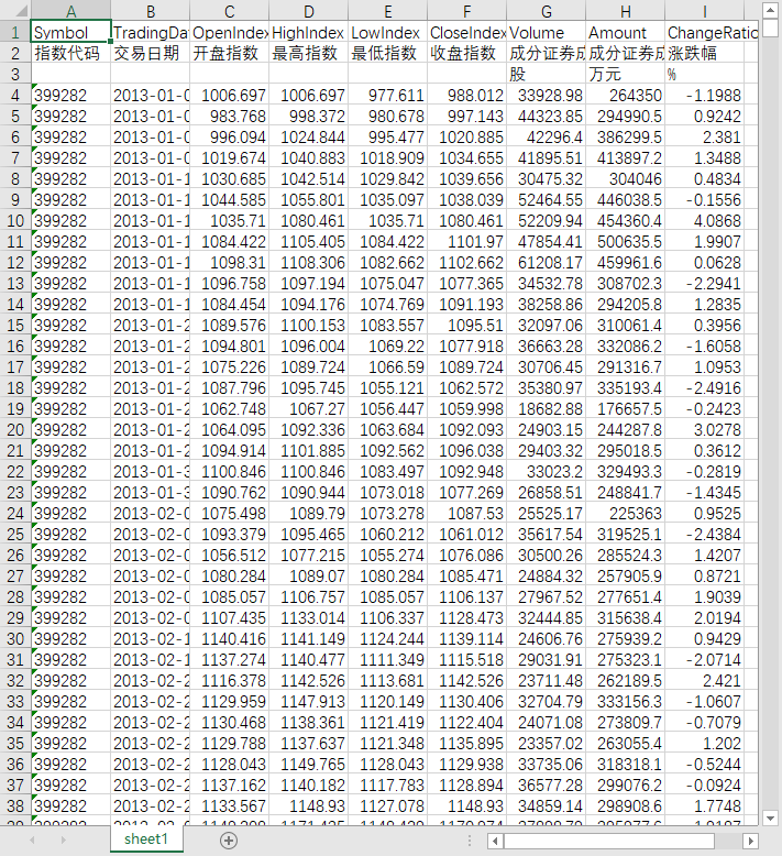 指数代码 交易日期 开盘指数 最高指数 最低指数 收盘指数 成分证券成交量 成分证券成交金额 涨跌幅
