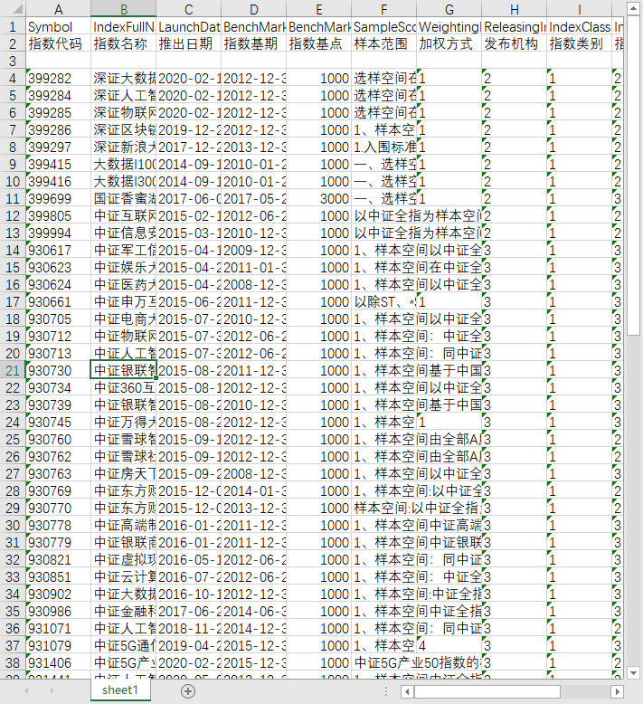 指数代码 指数名称 推出日期 指数基期 指数基点 样本范围 加权方式 发布机构 指数类别 指数类型 样本所属市场名称 计算方法