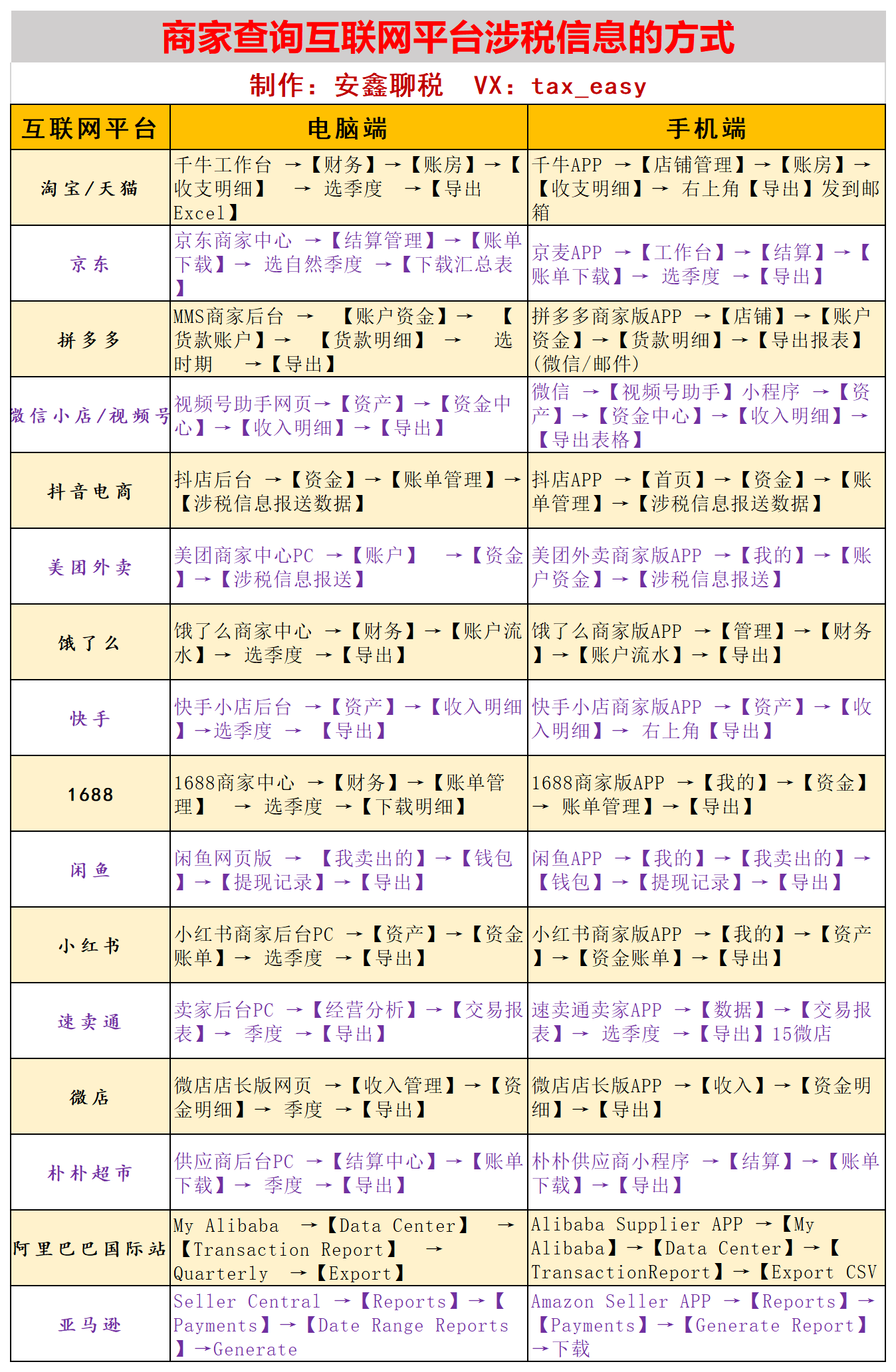 《互联网平台涉税信息报送规定》正式施行,2025年10月是首个报送期,10月下旬各省市电商先后收到税局短信,提示“申报的收入少于互联网平台企业报送的收入”,要求自查更正。对此需首先知道电商所使用的互联网平台报送给税局的具体数据,才能予以核对。为方便广大电商查询,对常用的互联网平台企业报送涉税信息查询方式进行了归集,制图如下: