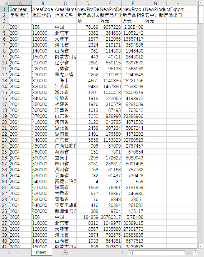 年度标识 地区代码 地区名称 新产品开发项目数 新产品开发经费支出 新产品销售收入 其中:新产品出口