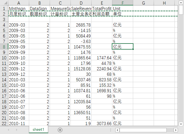 月度标识 数据标识 计量标识 主营业务收入 利润总额 单位