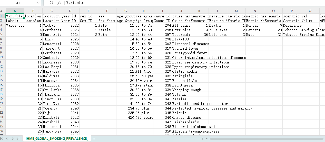 数据集名称:全球疾病负担研究2021(GBD 2021)吸烟死亡率和流行率预测数据集。