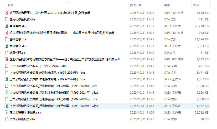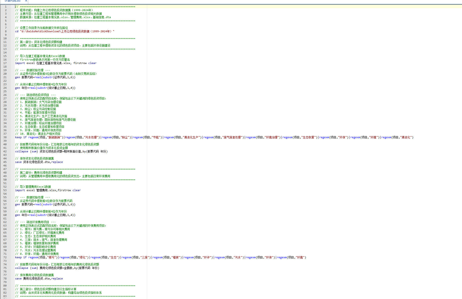 团队参考潘仙友等(2025)对绿色投资的衡量方法,手工搜集上市公司年度报告,从在建工程附注表中提取与环保直接相关的支出,加总后得到企业当年的资本化绿色投资额;将管理费用明细表中的绿化费、环评费等环保相关费用加总,以此衡量费用化绿色投资额。企业总绿色投资额为资本化绿色投资额和费用化绿色投资额之和