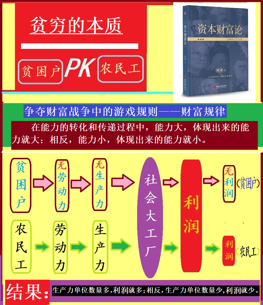 (2)、贫农贫困的深层原因:是因为“能力的转化机制”客观存在,即是“财富规律”的存在。在能力的转化和传递过程中,能力大,体现出来的能力就大;能力小,体现出来的能力就小。这就是著名的财富规律。根据“财富规律”的指令,“农民工有劳动能力,有生产力,那么就有收入;相反,贫困户没有劳动力,没有生产力,就没有收入,就贫穷。”