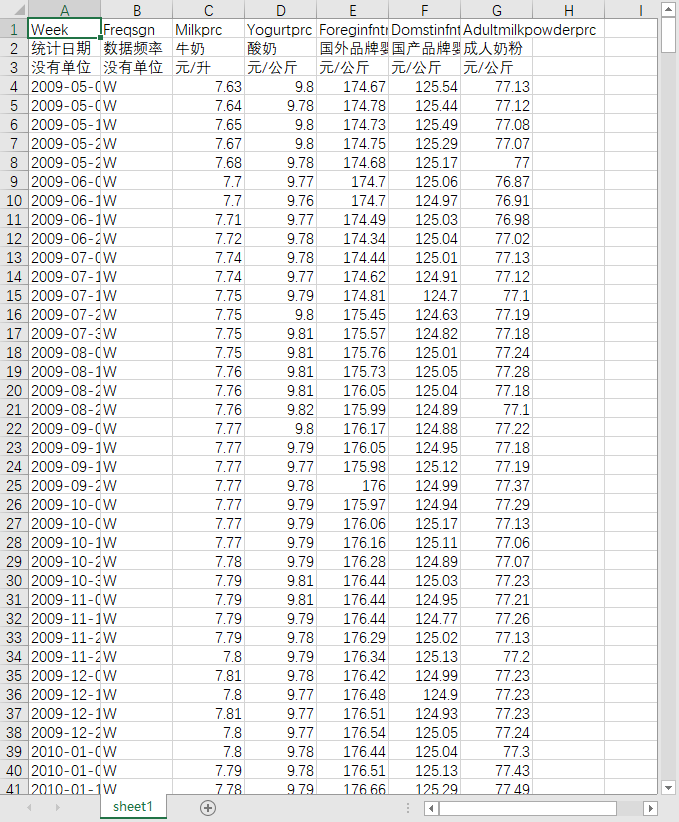 统计日期 数据频率 牛奶 酸奶 国外品牌婴幼儿奶粉 国产品牌婴幼儿奶粉 成人奶粉