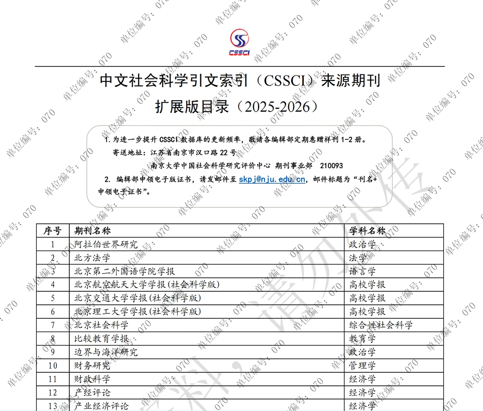 权威非网传版 CSSCI扩展版来源期刊目录(2025-2026年) 权威非网传版