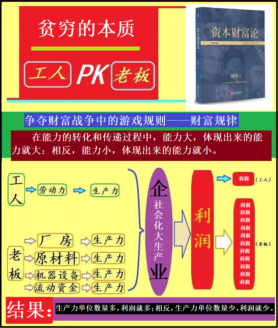 (2)、工人贫穷的深层原因是:是因为“能力的转化机制”客观存在,即是“财富规律”的存在。在能力的转化和传递过程中,能力大,体现出来的能力就大;能力小,体现出来的能力就小。这就是著名的财富规律。根据“财富规律”的指令,“老板用资本挣钱,资本多,生产力数量多,创造财富的能力大,那么就相对富裕;相反,工人用体力挣钱,生产力数量少,创造财富的能力小,那么就相对贫困。”