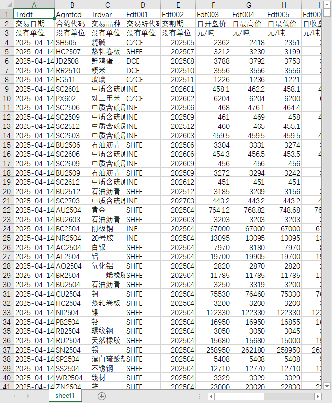 交易日期 合约代码 交易品种 交易所代码 交割期 日开盘价 日最高价 日最低价 日收盘价 日结算价 涨跌1 涨跌2 成交量 持仓量 持仓量变化 成交金额