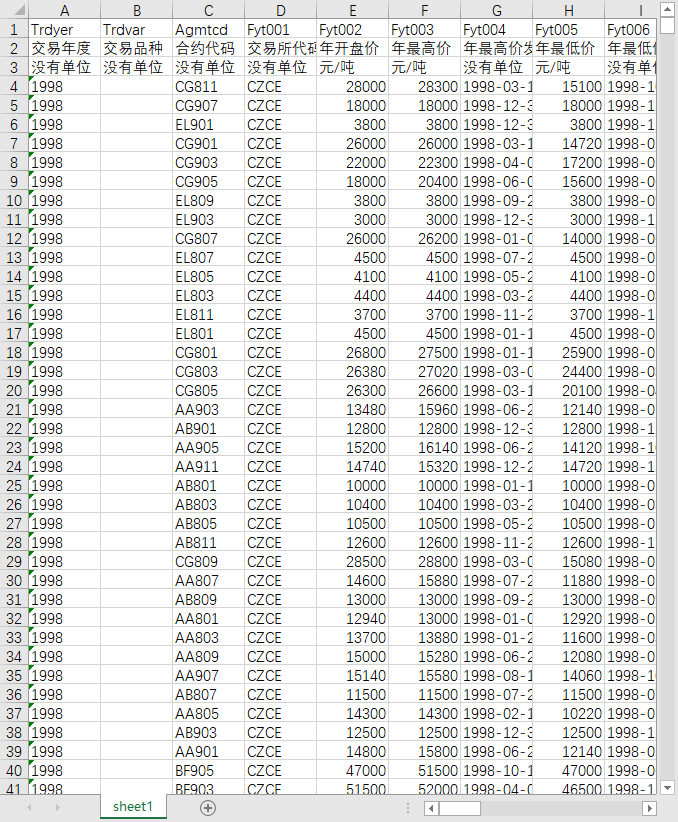 交易年度 交易品种 合约代码 交易所代码 年开盘价 年最高价 年最高价发生日 年最低价 年最低价日 年收盘价 年结算价 年最高结算价 年最高结算价发生日 年最低结算价 年最低结算价发生日 持仓量 年最高持仓量 年最高持仓量发生日 年最低持仓量 年最低持仓量发生日 年持仓量变化 年最高持仓量变化 年最高持仓量变化发生日 年最低持仓量变化 年最低持仓量变化发生日 年总交易量 年最高成交量 年最高成交量发生日 年最低成交量 年最低成交量发生日 年总成交额 年最高成交金额 年最高成交金额发生日 年最低成交金额 年最低成交金额发生日 年累积涨跌1 年累积涨跌2 年累计交易天数